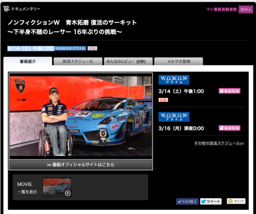 また、2015年3月には「WOWOW」にて青木拓磨を追ったドキュメント放送が決定しています。
