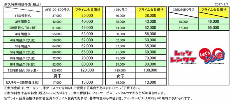 時間、サーキット別参加料金(基本料金となります)